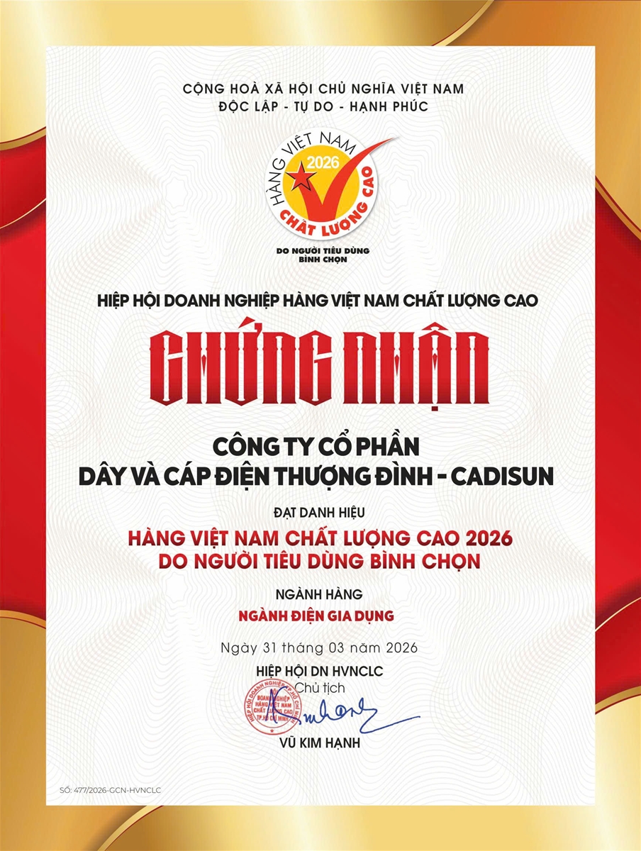 Hiệp hội Doanh nghiệp hàng Việt Nam chất lượng cao vừa tổ chức Lễ công bố và trao Chứng nhận Hàng Việt Nam chất lượng cao năm 2026 cho 581 doanh nghiệp tiêu biểu trên cả nước, trong đó có Công ty CP Dây và Cáp điện Thượng Đình (CADI-SUN).