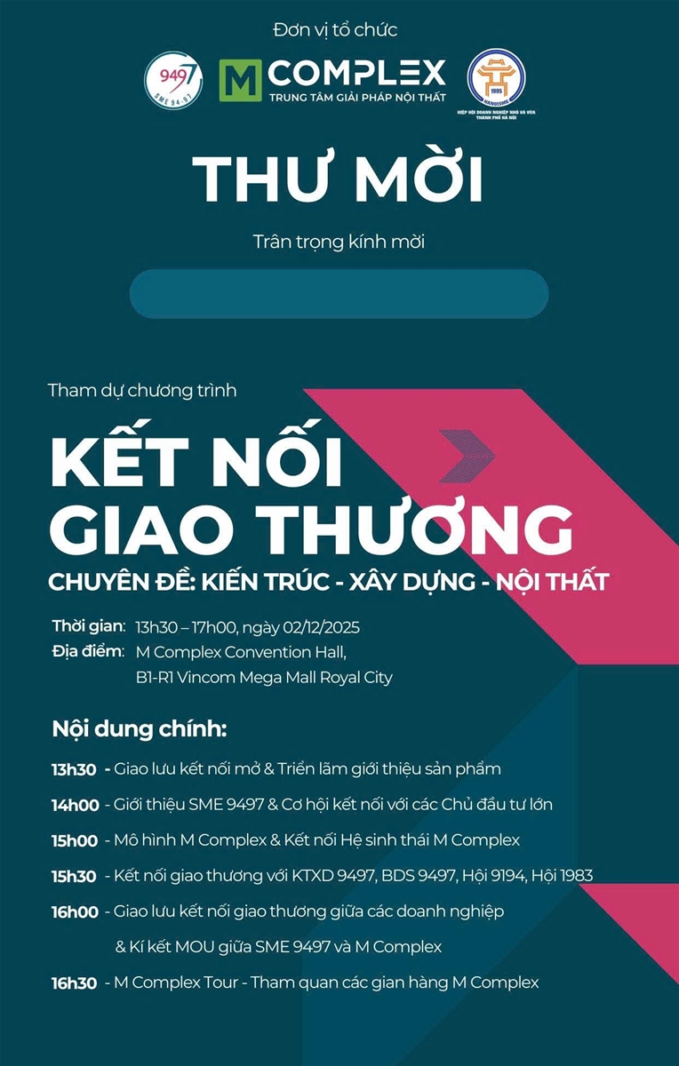 Thay mặt Trung tâm Giải pháp Nội thất M Complex, Câu lạc bộ SME 9497 và Hiệp hội Doanh nghiệp nhỏ và vừa TP Hà Nội, chúng tôi trân trọng kính mời Quý Anh/Chị tới tham dự Chương trình Kết nối Giao thương - Chuyên đề Kiến trúc, Xây dựng, Nội thất.